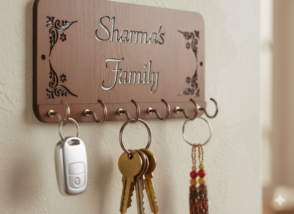The prominent display area is perfect for showcasing “Sharma’s Family” or your chosen customization, surrounded by delicate, decorative engravings that add a touch of sophistication. Below, six sturdy metal hooks provide ample space for all your household keys, ensuring they’re always in their place and easy to find.